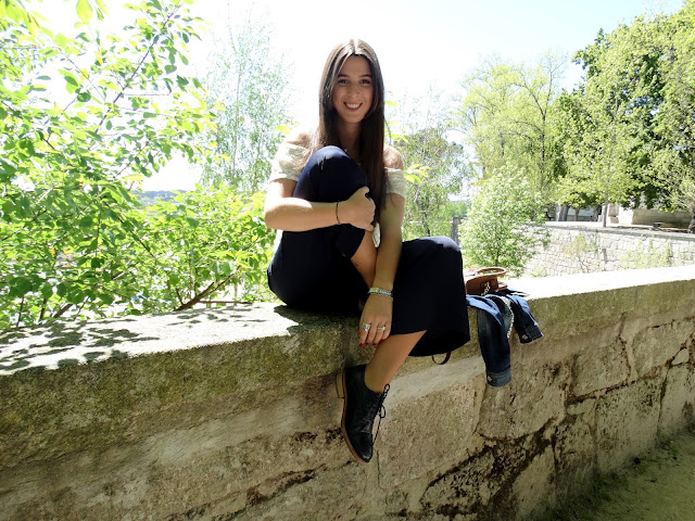 Como é óbvio este outfit foi da semana anterior e bem no início - assim quando estava Primavera a sério sabem? E coincidência que foi aquele tipo de dia que não fazia ideia do que vestir (até porque estava demasiado calor para o habitual - ironia máxima) e então decidi arriscar?! Foi o que me aconteceu! Nunca pensei aderir aos culottes, mas já que os tinha convinha que saíssem do armário pelo menos uma vez ou outra. Vesti-me a medo, a sério, achava que ia parecer um mini-palhaço em tons de azul! Mas vá, sem querer gabar-me gostei mesmo do resultado - os culottes cá estão e a blusa sem ombros finaliza na perfeição (sou super fã desta tendência e assim que vier o calor de vez vão entender porque). Apesar do calor descomunal optei por levar casaco - mesmo que tenha sido só para fazer feitio.